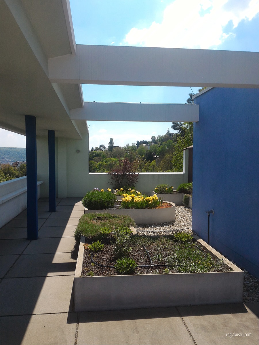 Benim en sevdiğim kısım teras oldu. Zaten kolon ve taşıyıcı duvar ayrımını özellikle burada gözümüze sokarken, çatı bahçesi ve evin harika manzarası ilkelerden bir diğeriydi. Daha eve dışarıdan bakarken betonarmenin estetikliği boy gösteriyordu. Her ne kadar betonarmeden nefret de etsem bu evi baya sevdim. Evin içine girdiğimde de neredeyse hiçbir eşyanın olmadığını gördüm. Örneğin kocaman bir odada sadece bir masa ve 2 sandalye vardı. Upuzun pencere içeriyi muazzam aydınlatıyordu ve yine harika bir manzara sunuyordu. Ayrıca banyoda küvetin manzarası da enfesti. Evin içindeki merdivenler ise çok basit bir şekilde kıvrımlı bir hatla oluşturulmuştu. Daha sonradan Le Corbusier’in diğer evlerinin fotoğraflarını gördüğümde her yerde aynı malzemeleri aynı kıvrımları kullandığını gördüm. Son olarak evin arka bahçesine indiğimde de geometrik düzeni ve yalınlığı bir kez daha görmüş oldum.